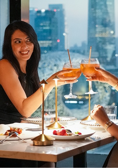Enjoy your lunch in a luxurious setting with stunning views of Dubai’s landmarks, creating the ideal ambiance for a memorable meal.